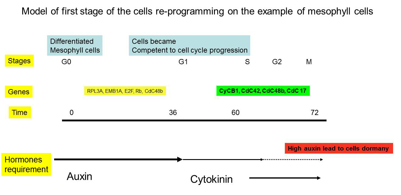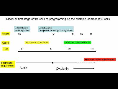 The first stage of cell re-programming from differentiated somatic cells include transition from differentiated cells (G0) to cycling one (G1). This step require application of the high auxin dosage for short period (10-48 hours). Duration of the treatments were largely dependent from the intial explants stages. If one have used fully differentiated mesophylll cells, such duration can be very long with high auxin dose (Medicago leaf protoplasts, for example, require up to 10 mkM 2,4-D). However, for some other plant species with lower level of differentiation even 2 mkM NAA for short time will be enough for G0-G1 transition (Nicotiana),